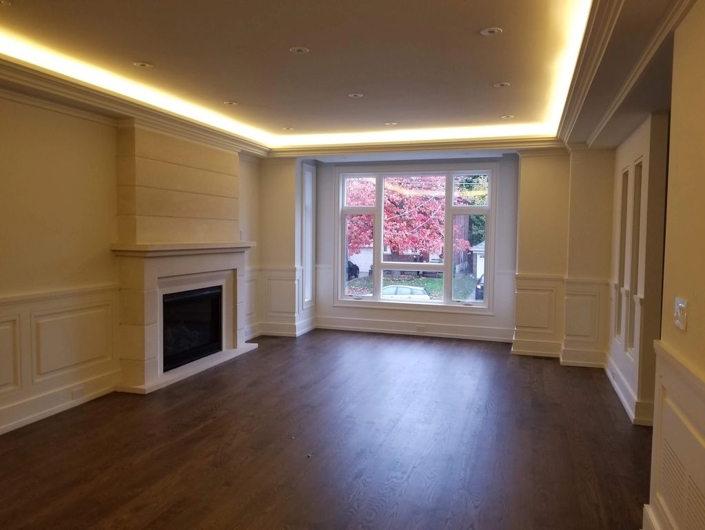 Full home renovations, hardwood installation, wainscoting, cast stone fireplace, detailed crown moulding.